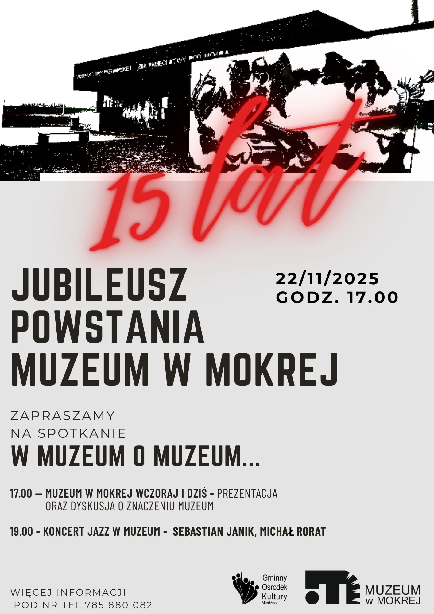 15 lat. Jeszcze nie pełnoletniość ale już ukończenie „podstawówki”. Muzeum Kultury Przeworskiej i Izba Pamięci Bitwy pod Mokrą w Mokrej kończy ten etap z całkiem dobrym wynikiem, a może nawet z „czerwonym paskiem”. Co w uzasadnieniu oceny? Około 3000 odwiedzających muzeum każdego roku. Goście z najodleglejszych zakątków Polski i zza granicy, o czym świadczą liczne wpisy w księgach pamiątkowych. Współpraca z oddziałami IPN (Wrocław, Katowice) owocująca licznymi wystawami. Współpraca z Muzeum Ziemi Mińskiej, Muzeum Częstochowskim, historykami, autorami publikacji dotyczących Bitwy pod Mokrą, archeologami (m.in. prof. Marcinem Biborskim – kierownikiem wykopalisk które były prowadzone w Mokrej), a także jednostkami wojskowymi i licznymi pasjonatami, co nie tylko poszerza znacząco ofertę muzeum ale i gwarantuje jej wysoki poziom. To lekcje muzealne i różnorodne warsztaty (samych „nieśmiertelników” odwiedzający Muzeum wybili już ponad 3 tys). To autorskie duże wydarzenia z okazji Nocy Muzeów – pikniki archeologiczne i militarne. To udział w projekcie „znaczków turystycznych”, dzięki któremu Muzeum odwiedzają ich kolekcjonerzy. To zrealizowany własny projekt zwieńczony publikacją i wystawą poświęconą losom gen. Juliana Filipowicza. W 2010 r Muzeum zaczynało skromnie – z około 80 eksponatami. Dziś gromadzi ich ponad 600, a kolekcja z Mokrej gościła nawet na wystawie na Jasnej Górze. Dziękujemy wszystkim, którzy 22 listopada świętowali jubileusz 15-lecia i zapraszamy do Muzeum w Mokrej.