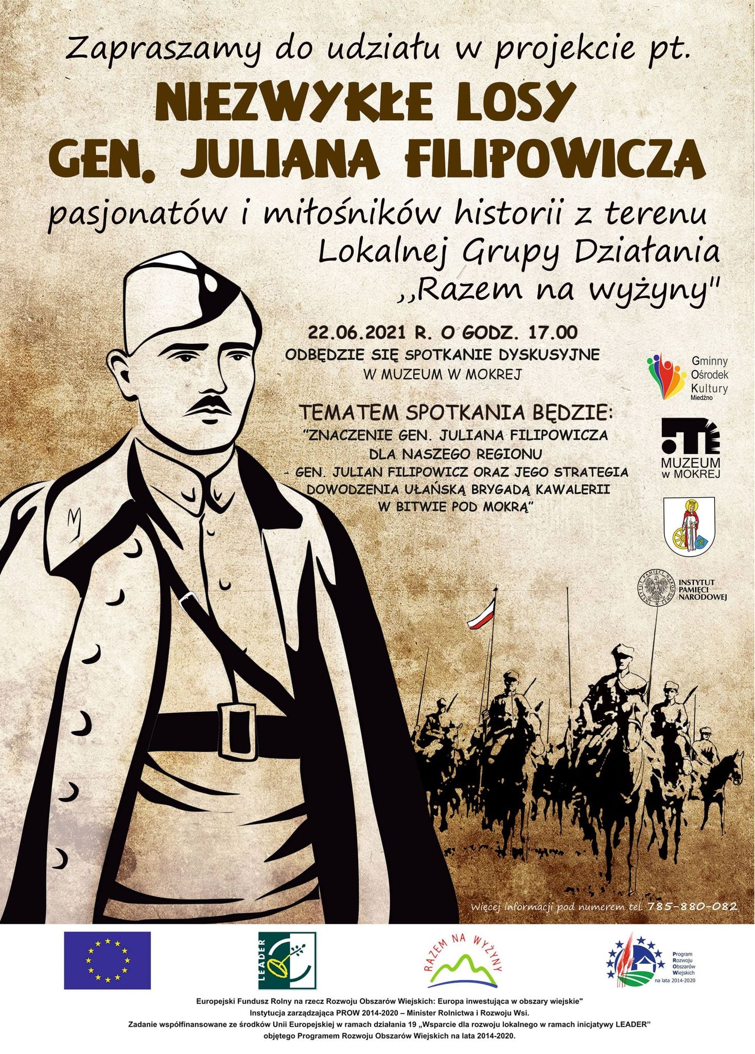 22 czerwca w Muzeum w Mokrej spotkali się pasjonaci historii. Podczas konferencji podsumowującej projekt "Niezwykłe losy Gen. Juliana Filipowicza" dyskutowano m.in o strategii dowodzenia Generała Wołyńską Brygadą Kawalerii podczas Bitwy pod Mokrą. Symbolicznego odsłonięcia wystawy plenerowej dokonali: główny prelegent pan Kazimierz Skrzesiński i Kierownik biura LGD "Razem na Wyżyny" pani Edyta Bauć. Zapraszamy do odwiedzenia Muzeum a wkrótce zaprezentujemy reportaż z wydarzenia.