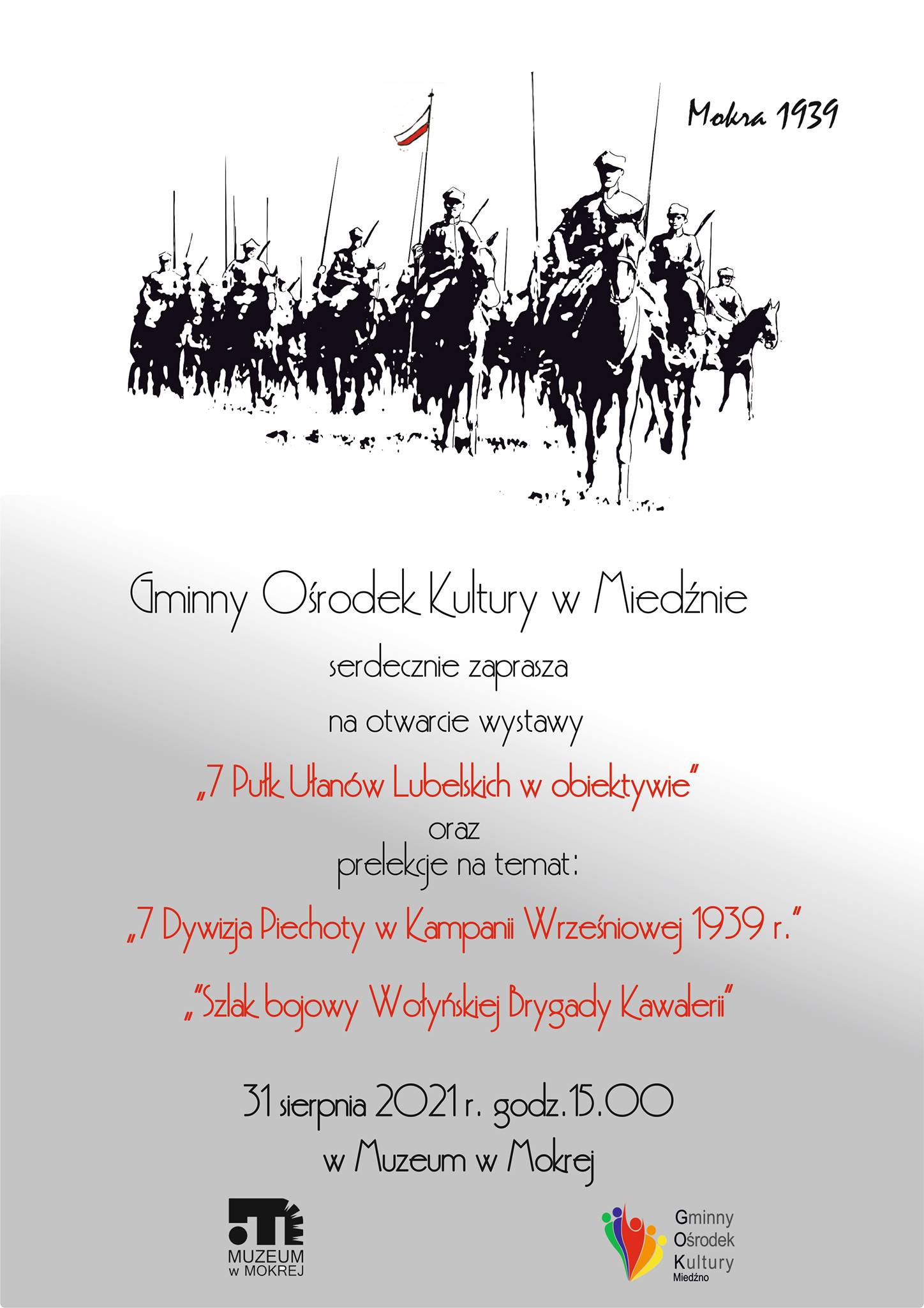 31 sierpnia w Muzeum w Mokrej okazał się szczególnym dniem upamiętnienia tego, co 82 lata temu działo się na naszej ziemi. Wystawa "7 Pułk Ułanów Lubelskich w obiektywie" to kolejne już nawiązanie do osoby Generała Juliana Filipowicza, który dowodził polskimi siłami w Bitwie pod Mokrą. Popołudniowe otwarcie wystawy zostało wzbogacone o prelekcje wygłoszone przez Panów: Kazimierza Skrzesińskiego i Mariusza Grzyba. Wśród zaproszonych gości na sali byli m.in. członkowie rodziny ś.p. Gen. Juliana Filipowicza oraz Wójt Gminy Miedźno - Pan Piotr Derejczyk. Szczególne podziękowania kierujemy w stronę Pani Katarzyny Szymczyńskiej, która odpowiadała za wywołanie fotografii z kilkudziesięcioletnich negatywów.